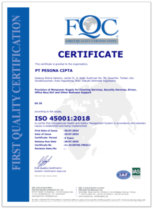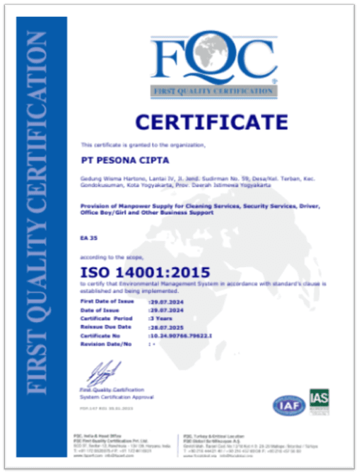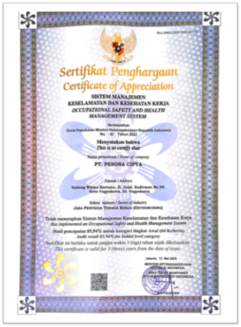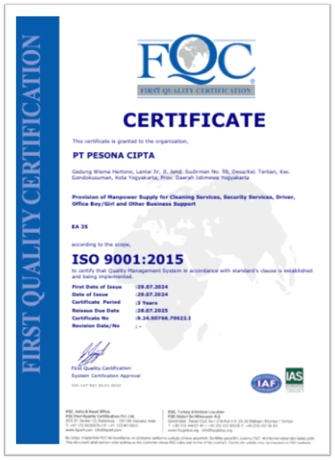 Sertifikasi yang kami miliki menjadi bukti komitmen Pesona Cipta dalam menjaga kualitas dan keandalan layanan. Melalui standar profesional yang terukur dan pelatihan berkelanjutan, kami memastikan setiap tenaga kerja hadir dengan kompetensi terbaik dan siap memberikan layanan yang aman serta terpercaya.